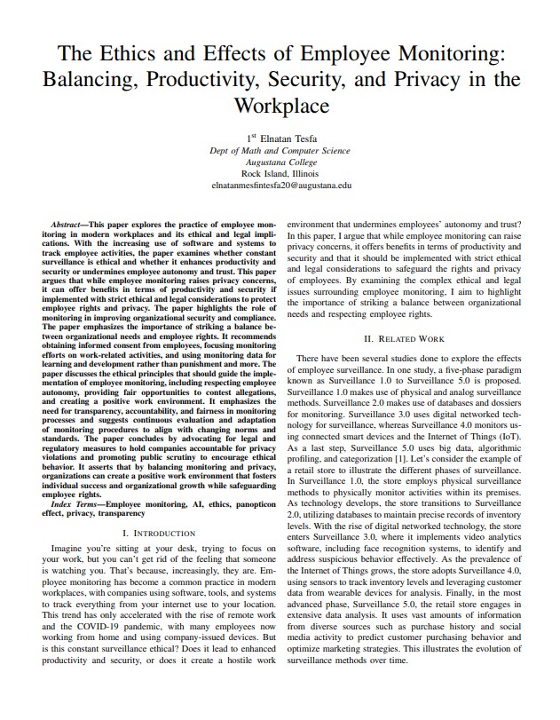 I wrote this paper to explore the ethics and legal considerations of employee monitoring in our current society. I investigate whether constant surveillance is morally acceptable and if it improves productivity and security or damages employee autonomy and trust in light of the growing usage of software and systems to track employee activity. I argue that although employee monitoring presents privacy issues, it can have positive effects on productivity and security if done so while adhering to rigorous moral and legal guidelines that safeguard employee rights and privacy.