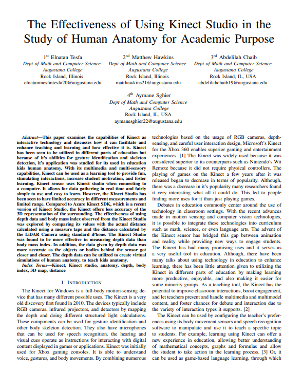I wrote this paper with my computer science peers where we explored the potential of using Kinect Studio, an interactive technology, as a tool for teaching human anatomy to students. In the paper, we discussed the multimedia and multi-sensory capabilities of Kinect and how it can provide fun, stimulating interactions that foster learning and increase student motivation. We compared the effectiveness of Kinect Studio to Azure Kinect SDK in terms of accuracy and range. We then conducted experiments to measure the accuracy of depth data and body mass index obtained from Kinect Studio and compared it to actual measurements taken with a tape measure and a LiDAR Camera. We conclude that Kinect Studio can be effective in measuring depth data and can be used to create virtual simulations of human anatomy for teaching purposes.