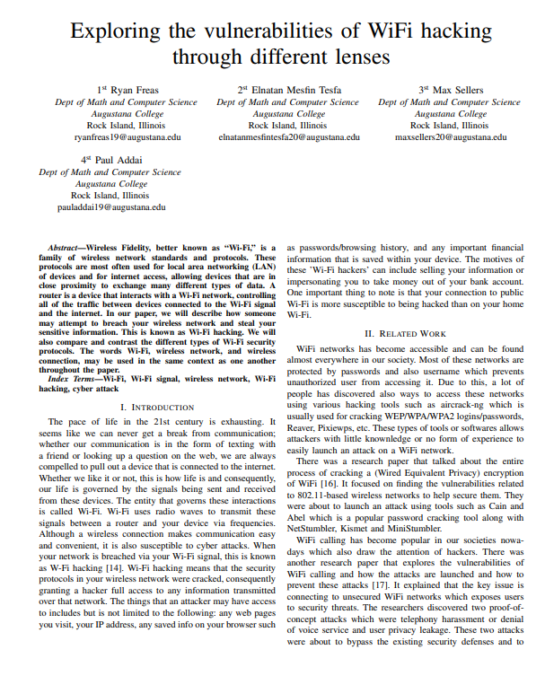 I wrote this paper with my computer science peers where we discussed the vulnerabilities of Wi-Fi networks to hacking and stealing sensitive information. Then we explored the different types of Wi-Fi security protocols and compared and contrasted them. Afterwards, we highlighted the weaknesses of the Wired Equivalent Privacy (WEP) protocol and other protocols, which was phased out due to security flaws, and the importance of having strong passwords to protect against brute force attacks. We conclude by emphasizing the need for updating passwords frequently and avoiding default passwords to prevent hackers from accessing the system.